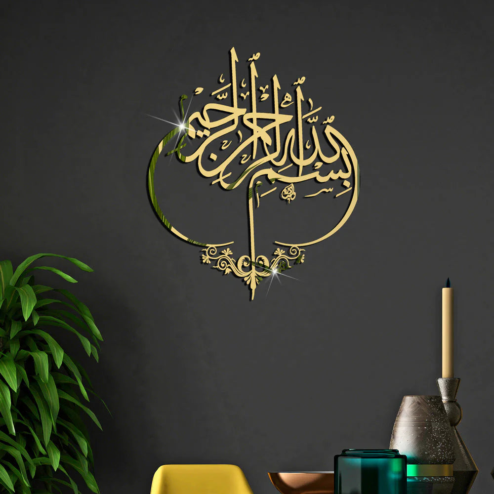 The unique metal Bismillah wall art shown in the product image is pronounced as Bismillah ir-Rahman ir-Rahim and is a beautifully poetic phrase that offers both deep insight and brilliant inspiration. The Bismala is an important reminder of remembering Allah in our dealings with others, in our personal lives, and in many other situations. Let this modern Islamic calligraphy wall art phrase accompany your own words and works, and let the mention of the All-merciful and the Compassionate be a source of blessing in it for you.