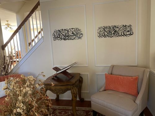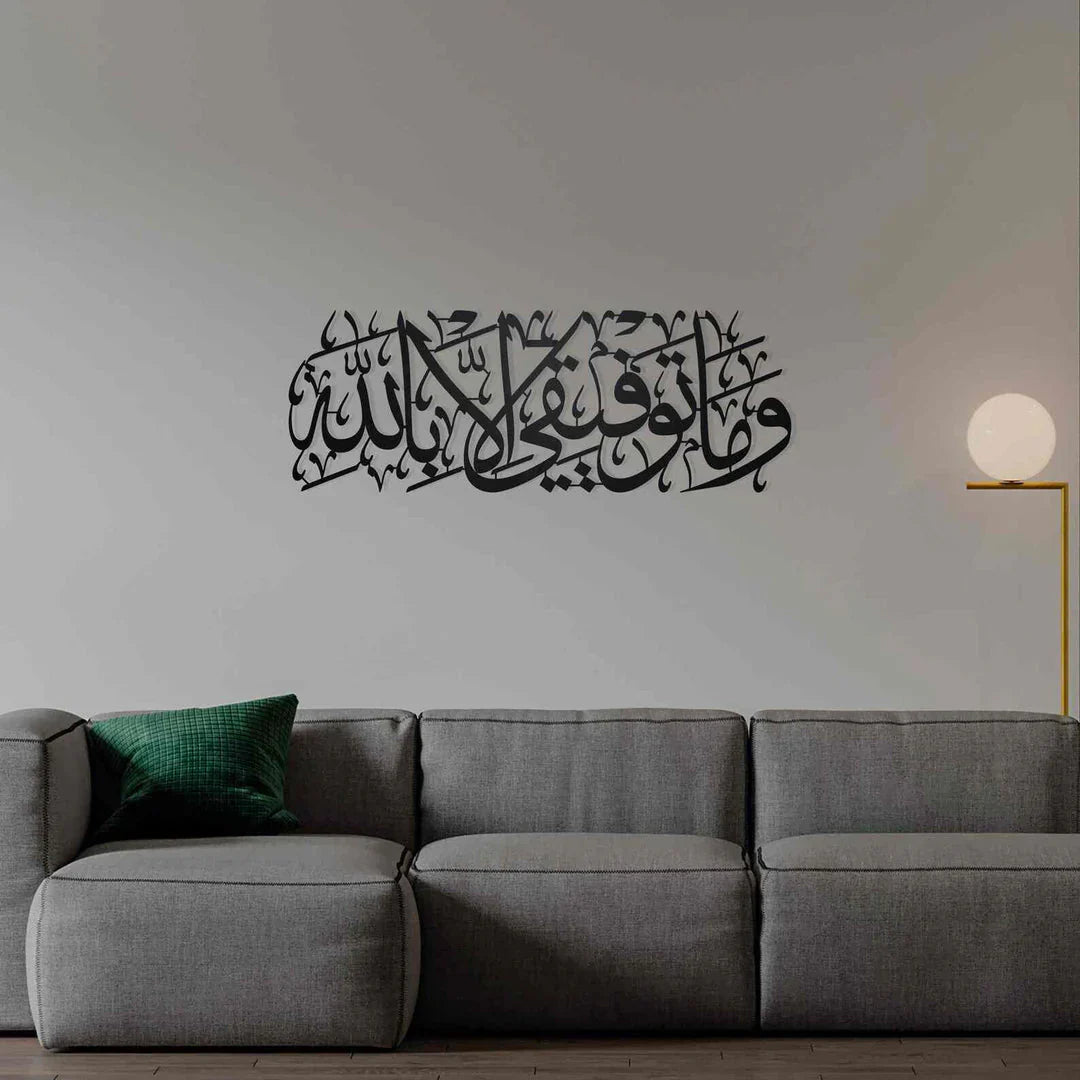 In this metal wall art, a phrase is written, which is a section from the 88th Verse of the Surah Hud and is also used as the "Dua for Success".This large metal wall art is not only a captivating piece of decor but also a spiritual emblem, crafted to bring serenity and reflection into your living room. The art piece combines the beauty of Quran wall art with the durability of metal, ensuring it stands as a lasting addition to your space. Our Islamic wall decor enhances any area it adorns, offering both aesthetic pleasure and a meaningful connection to your faith. Perfect for those who appreciate Islamic culture, this elegant artwork serves as a constant reminder of spiritual wisdom and artistic heritage.