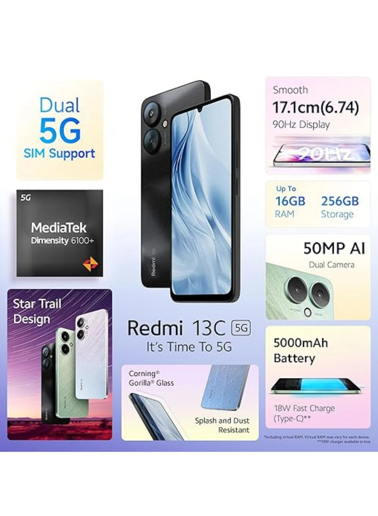 The Redmi 13C is a budget-friendly smartphone designed to deliver smooth performance and reliable connectivity. It features a large 6.74-inch HD+ Dot Drop display with a 90Hz refresh rate, ensuring fluid visuals for gaming, browsing, and video playback. Powered by the MediaTek Dimensity 6100+ chipset, coupled with 6GB RAM and 128GB internal storage (expandable up to 1TB via microSD), it offers ample space and efficient multitasking capabilities. The dual rear camera setup, highlighted by a 50MP main sensor, captures crisp and vibrant photos. A robust 5000mAh battery with 18W fast charging support ensures all-day usage. Encased in a sleek black finish with a textured design, the Redmi 13C combines style with functionality